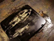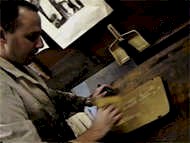 Then he put a piece of paper on the stone, blotters on the paper, a greasey plastic tympan on the blotter, and ran them through the press.