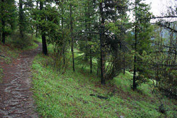 In the meadow, out of the forest, on the path across the top of the meadows, I could see Nahahi ridge. I could see that the trail went to the small cliff face on the ridge and followed it down to where the trees grew through it.